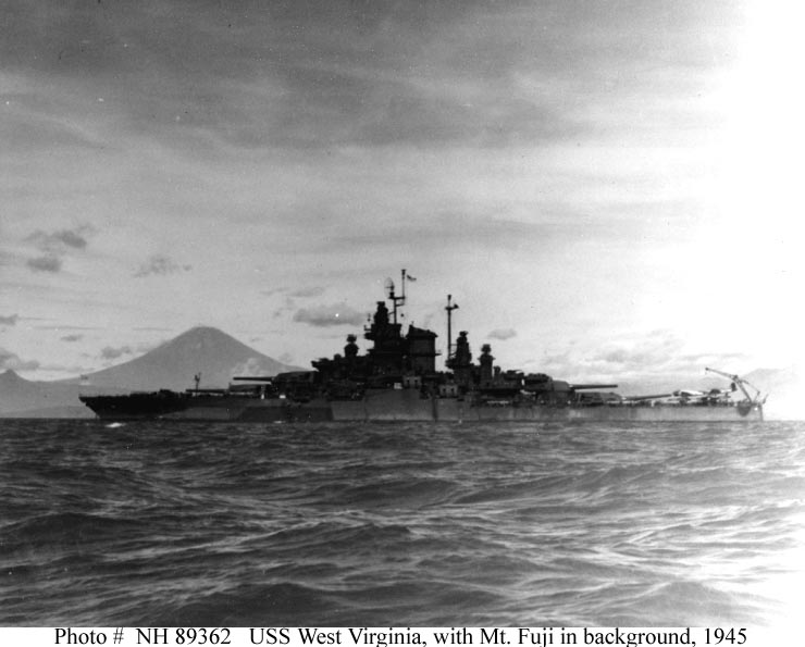 Photo #: NH 89362 USS West Virginia (BB-48) Anchored in Sagami Wan, Japan, outside of Tokyo Bay, circa late August 1945. Mount Fuji is in the background. Courtesy of Robert O. Baumrucker, 1978. U.S. Naval Historical Center Photograph. Online Image: 56KB; 740 x 595 pixels |
