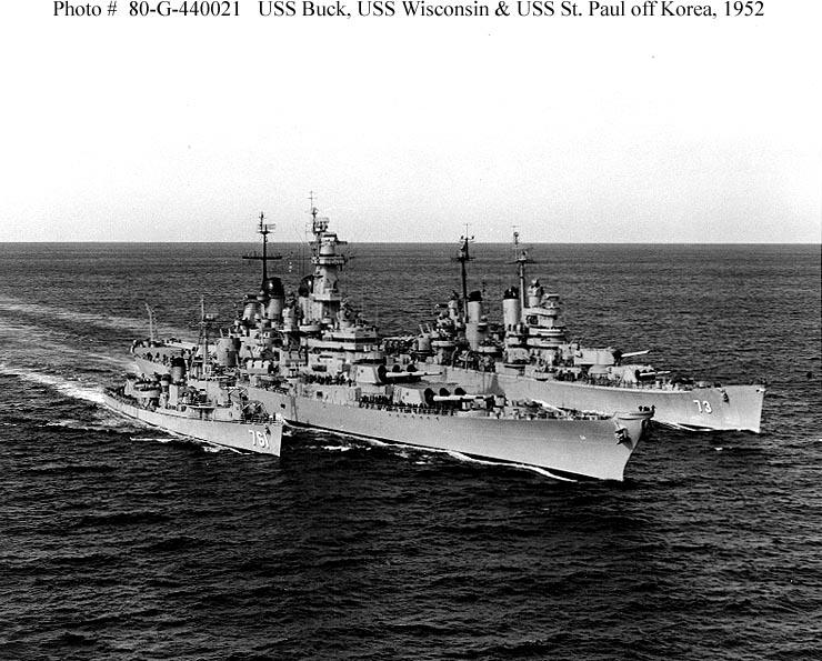 Photo #: 80-G-440021 USS Buck (DD-761), USS Wisconsin (BB-64) and USS Saint Paul (CA-73) Steaming in close formation during operations off the Korean coast. Photo is dated 22 February 1952. Official U.S. Navy Photograph, now in the collections of the National Archives. Online Image: 116KB; 740 x 595 pixels Reproductions of this image may also be available through the National Archives photographic reproduction system. |