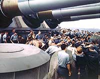 Photo #: 80-G-K-3667 (Color) USS Wisconsin (BB-64) Band concert under the battleship's after 16"/50 guns, while she was operating at sea with the Pacific Fleet, circa 1945. An aircraft carrier is faintly visible in the right distance. Sailor in right foreground has name J.C. Smith stencilled on his working jacket. Official U.S. Navy Photograph, now in the collections of the National Archives. Online Image: 122KB; 740 x 605 pixels Reproductions of this image may also be available through the National Archives photographic reproduction system. |