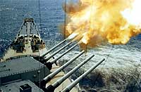 Photo #: NH 97207-KN (Color) USS Wisconsin (BB-64) Firing a broadside to port with her 16"/50 and 5"/38 guns, circa 1988-91. Official U.S. Navy Photograph, from the collections of the Naval Historical Center. Online Image: 136KB; 740 x 615 pixels |