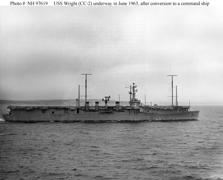 Photo #: NH 97620 USS Wright (CC-2) Underway, 17 June 1963, after conversion to a command ship. Official U.S. Navy Photograph, from the collections of the Naval Historical Center. Online Image: 113KB; 740 x 600 pixels |