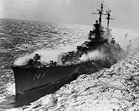 Photo #: NH 97335 USS Worcester (CL-144) Testing her anti-nuclear radiation "washdown" system, 7 July 1954. The original caption reads: "USS Worcester ... steaming under a protective water screen during atomic defense maneuvers. The ship employs its salt water system to cleanse itself of radioactive debris resulting from an atomic attack. The water carrying the radioactive debris is shown being discharged into the sea." Official U.S. Navy Photograph, from the collections of the Naval Historical Center. Online Image: 148KB; 740 x 615 pixels |