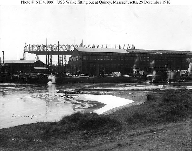 Photo #: NH 2773 USS Walke (Destroyer # 34) Fitting out at the Fore River shipyard, Quincy, Massachusetts, 1 July 1911. The ship has awning and bridge cover framing installed, but still lacks her guns and torpedo tubes. Walke was placed in commission three weeks later, on 22 July. U.S. Naval Historical Center Photograph. Online Image: 117KB; 740 x 580 pixels |