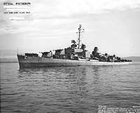 USS Walke, a 2200-ton Allen M. Sumner class destroyer, was built at Bath, Maine. Commissioned in January 1944, she visited Washington, D.C. in mid-February, while en route to undergo shakedown training off Bermuda. The new destroyer also took part in underway refueling and sonar tests before crossing the Atlantic in May to participate in the next month's Normandy invasion. Walke returned to the U.S. in July 1944 and in September transited the Panama Canal to join the war against Japan. She arrived in the western Pacific in November to help screen the Third Fleet's aircraft carriers during strikes on targets in the Philippines. In December she participated in landings at Ormoc Bay and Mindoro. During the latter operation she used her guns to destroy the grounded Japanese destroyer Wakaba. In her next mission Walke protected minesweepers that were clearing Lingayen Gulf for the invasion of Luzon. While so engaged on 6 January 1945 she was attacked by four enemy suicide planes, one of which struck the ship's forward superstructure. Walke was extensively damaged and thirteen of her crew lost their lives, among them her Commanding Officer, Commander George F. Davis. However, she remained on station for three more days before retiring to safer waters, and ultimately steaming back to the U.S. for repairs.