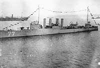 Photo #: NH 100642 USS Woolsey (Destroyer # 77) Dressed with flags in 1919. The five-masted schooner in the middle distance indicates that the location may be Hampton Roads, Virginia, where Woolsey arrived 8 July 1919 after escorting President Woodrow Wilson across the Atlantic from Brest, France. Courtesy of Jack Howland, 1986. U.S. Naval Historical Center Photograph. Online Image: 82KB; 740 x 530 pixels |