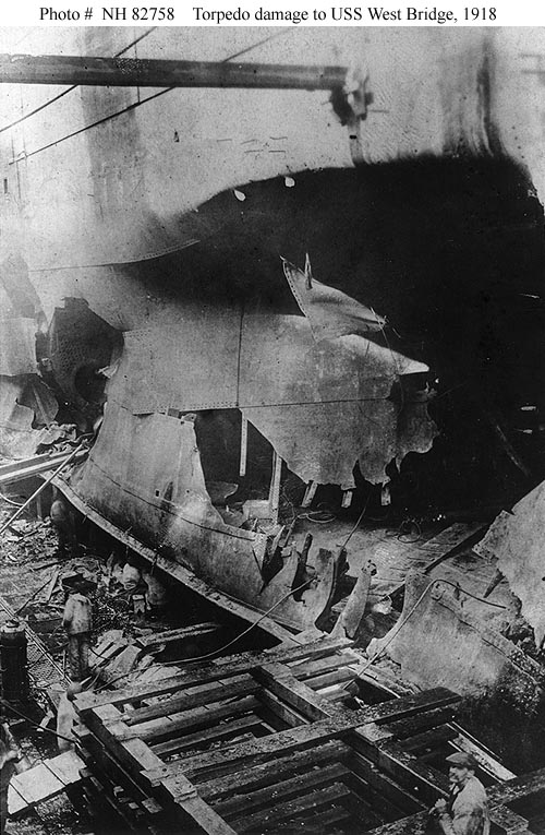 In the late afternoon of 15 August 1918 USS West Bridge was steaming in convoy toward France when she suffered a casualty in her steam turbine. The problem forced her to drop out of formation and call for a tow. A few minutes later the German submarine U-90 torpedoed S.S. Montanan, another member of the convoy, inflicting damage that ultimately proved fatal. Realizing the peril, West Bridge's commanding officer sent his crew to general quarters and evacuated most men from the machinery spaces.