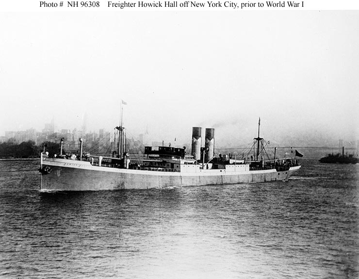Note: In addition to her two smokestacks, the former British merchantman Howick Hall had a rather unusual upper hull configuration, with two islands amidships and a short well aft. Some of these ships also had kingpost pairs in addition to their masts.