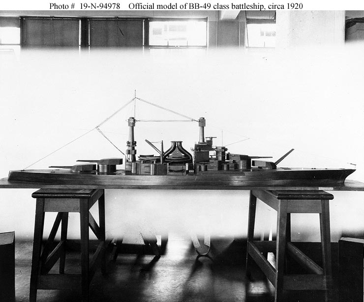 Photo #: 19-N-94978 South Dakota class battleship (BB 49-54) Official model, photographed circa 1920. The ships of this class, none of which were completed, were: South Dakota (BB-49); Indiana (BB-50); Montana (BB-51); North Carolina (BB-52); Iowa (BB-53); Massachusetts (BB-54); Photograph from the Bureau of Ships Collection in the U.S. National Archives. Online Image: 67KB; 740 x 615 pixels Reproductions of this image may also be available through the National Archives photographic reproduction system. |