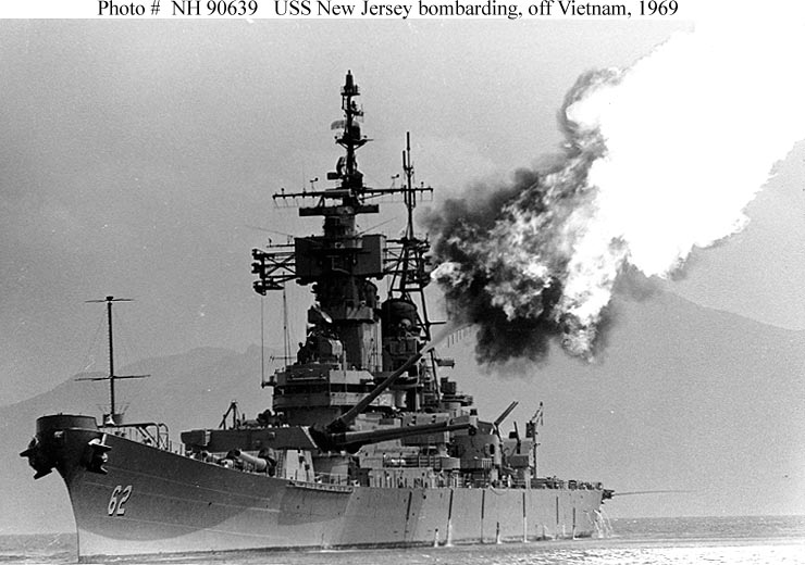 Photo #: NH 90639 USS New Jersey (BB-62) Bombarding enemy targets near Tuyho, on South Vietnam's central coast, during her last line period, late in March 1969. Photographed by PH2 Monty L. Tipton. Official U.S. Navy Photograph, from the collections of the Naval Historical Center. Online Image: 75KB; 740 x 520 pixels |