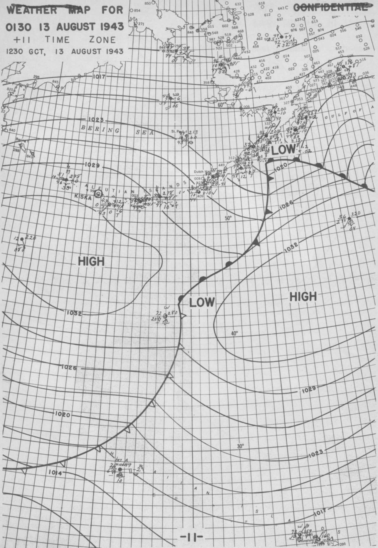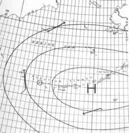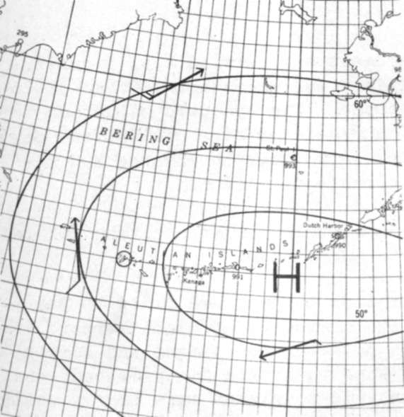 The more usual situation consists of a low pressure area extending over some portion of the Aleutian Islands. With this weather pattern the wester part of the island chain has northwesterly winds. The landing at Kiska would have been difficult had this weather situation prevailed on 15 August. ![]()