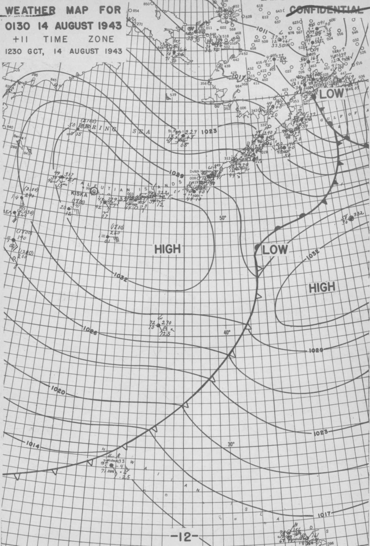 "Kiska and surrounding sea area, 15 August: Overcast sky with fog and drizzle; ceiling and visibility near zero throughout open sea areas and on southeast (windward) side of Kiska. On northwest side of island, slight clearing of fog with base of low overcast at 500 to 1,000 feet, tops at 2,000 -3,000 feet; visibility 3-5 miles; scattered high clouds. in open sea, winds south to southeast 15-20 knots. No appreciable change in Kiska weather expected through Dog plus One Day."