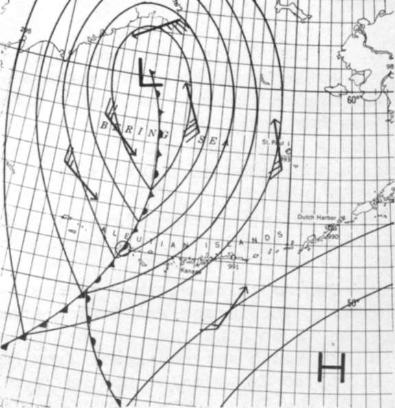 An operation scheduled in the Aleutian Island area is most dependent on weather. These islands, located far out in the Pacific and at the point of interaction of the cold ocean currents to the north and the warmer ones from the south, are subject to more bad weather than almost any other region of the world. In an attempt to simplify a very complex situation, it may be said that the predominance of bad weather during the summer season can be attributed to two main factors. Normally, during this season, there is a region of high pressure fairly stationary off the west coast of the American continent. Weather fronts which originate in Asia proceed across the Pacific and become stalled against the western portion of this region of high pressure. Along a stationary front, open waves (small storm centers) often develop with great frequency and travel at high speed along the front. These waves, traveling northeastward along the western boundary of the high pressure area, pass the Aleutian Island chain, bringing with them periods of bad weather.