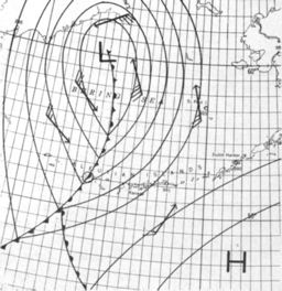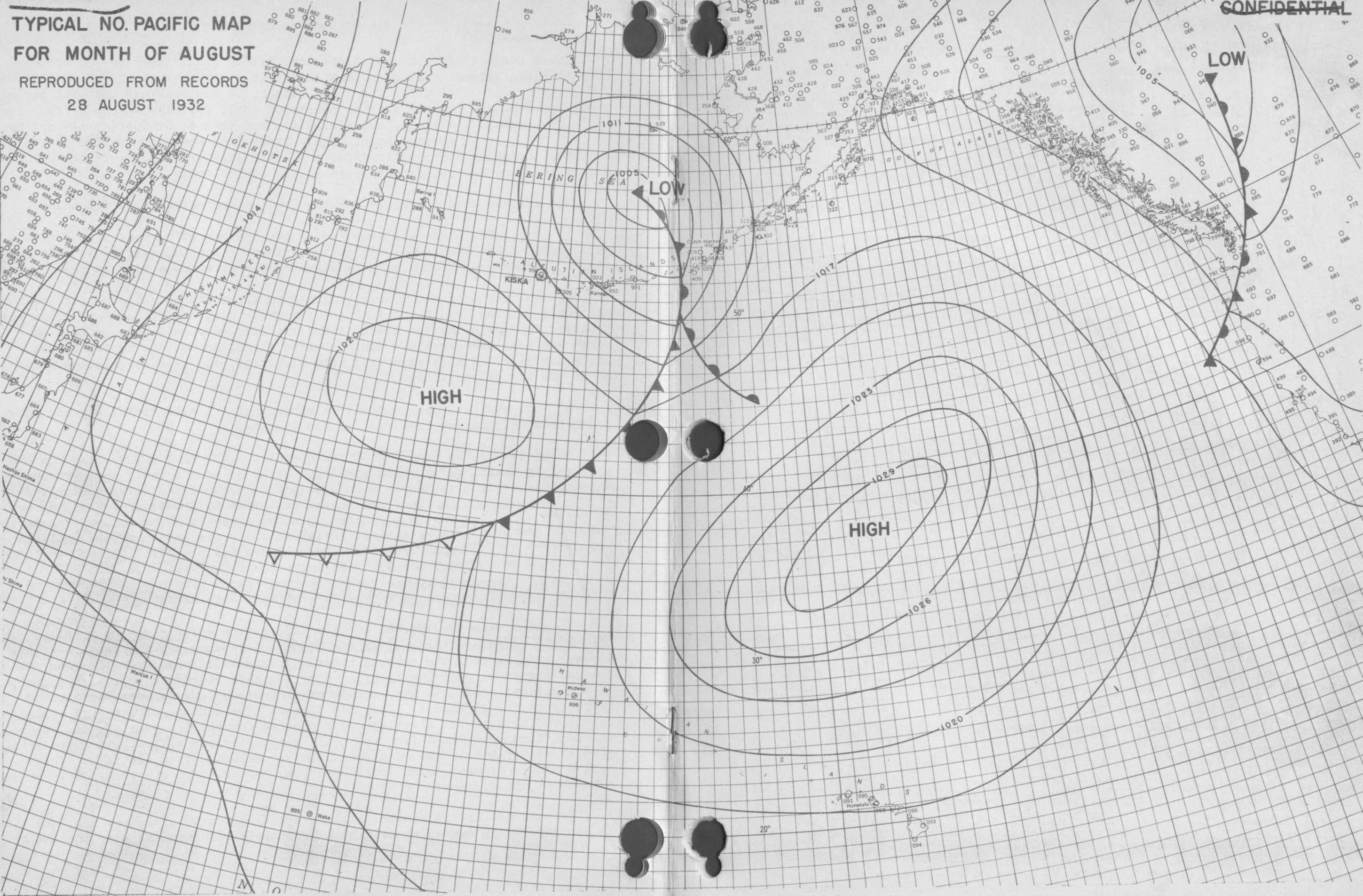 To illustrate the type of weather information which might be supplied during the planning stages of an operation and to show how the pattern of air masses existing over the islands around 15 August differed from the mean, a typical August map for the Aleutian area has been reproduced herewith (p.6-7). In the selection of this map, a file of 10 years of August maps was studied before that for 28 August, 1932, was chosen. The centers of pressure systems in the vicinity of the Aleutians were plotted for the ten-year period. With the positions determined from the plot, a synoptic map with high and low pressure areas located in the mean positions was selected from the file. There were a number of maps which could have been chosen. The one for 28 August, 1932, was one of the simplest.
