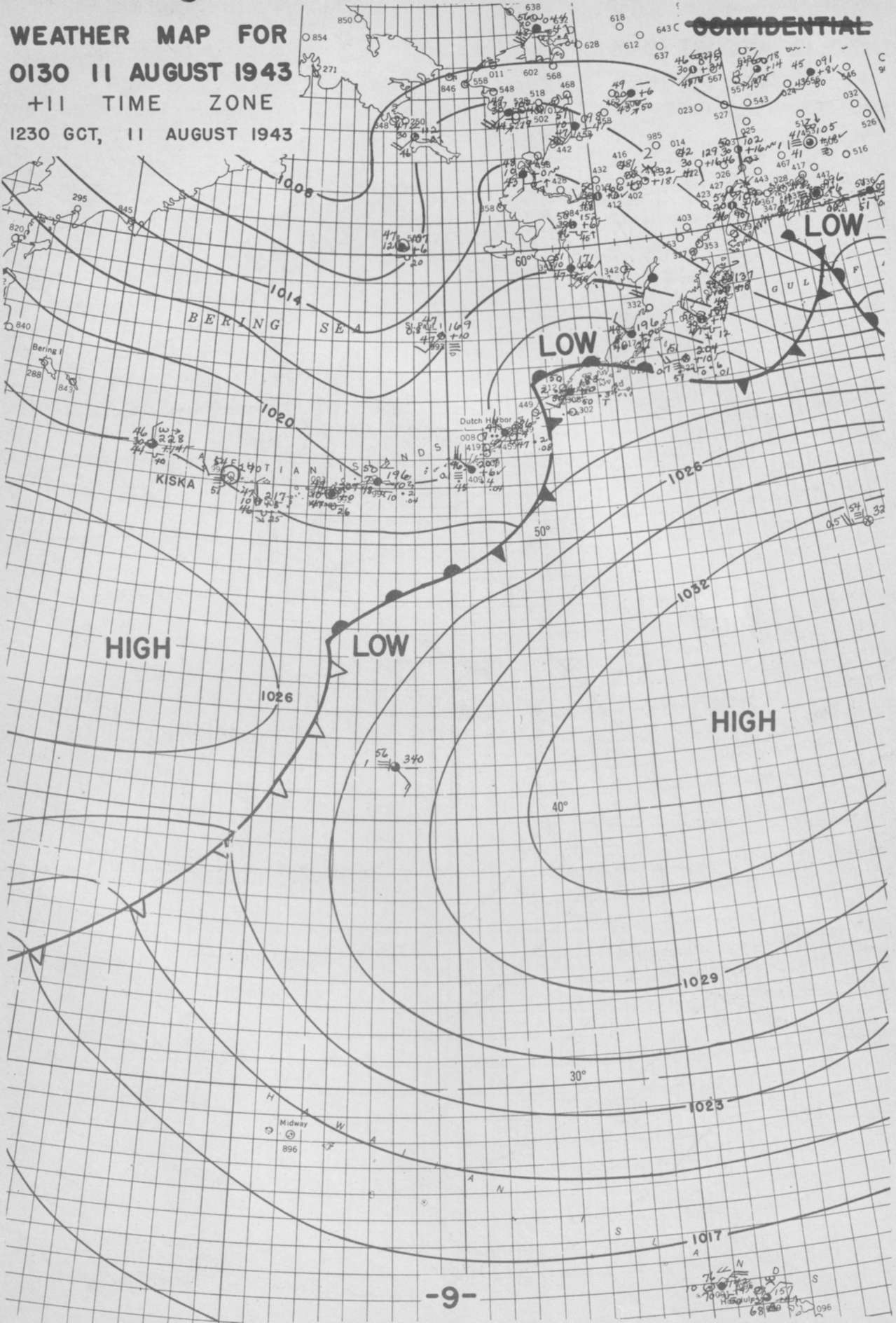 Only on the 15th were there any positive indications that a frontal system was approaching from the west. Reference to the map for 16 August on page 16 shows the position of this front. Although the wind direction at Kiska would change with the frontal passage, by this time the initial landings would be completed and the wind direction would no longer be a matter of major importance.