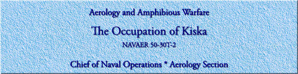 4. Most significant of all was the use of auxiliary weather aids in connection with the occupation of Kiska. For both the preliminary bombardment and the landings, a definite weather pattern was required if the operations were to proceed with maximum speed and minimum loss. In order to overcome the handicap to accurate weather analysis caused by the existence of large gaps in the reporting network of stations, planes, destroyers, and submarines were employed as temporary observing stations.