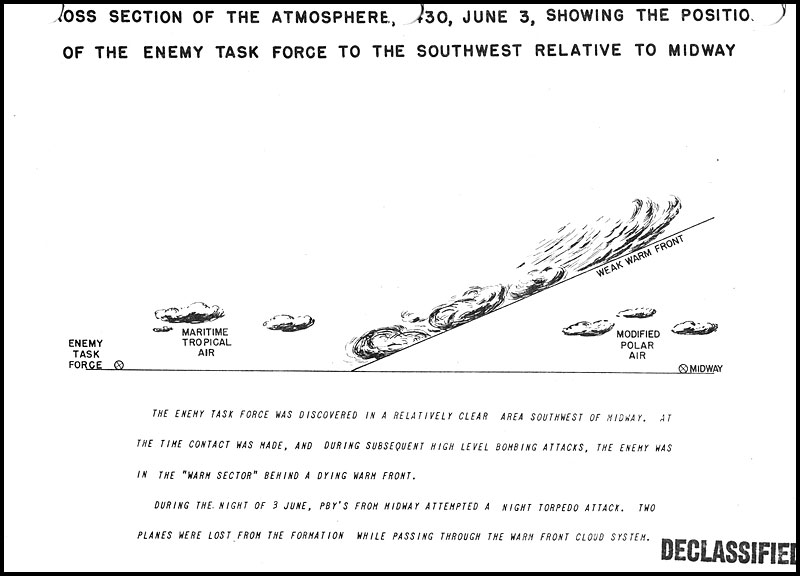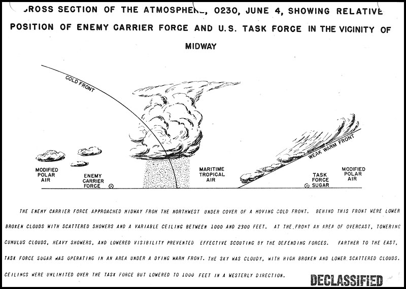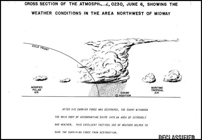 The Japanese suffered a severe defeat at Midway. Had they made less skillful use of the weather, defeat might have turned into annihilation. In the initial stages of the attack, their use of the weather furnished concealment for their approaching carrier force behind a moving front. During the battle, their tactical employment of cloud cover and local shower areas decreased their losses by hampering the activities of our scouting planes and the efficiency of our bombing and torpedo squadrons. Later, when their air power was eliminated and retreat was essential, accurate evaluation of the current