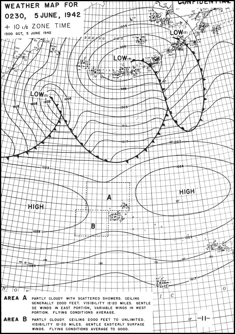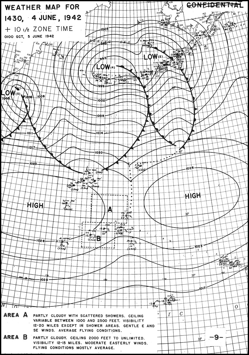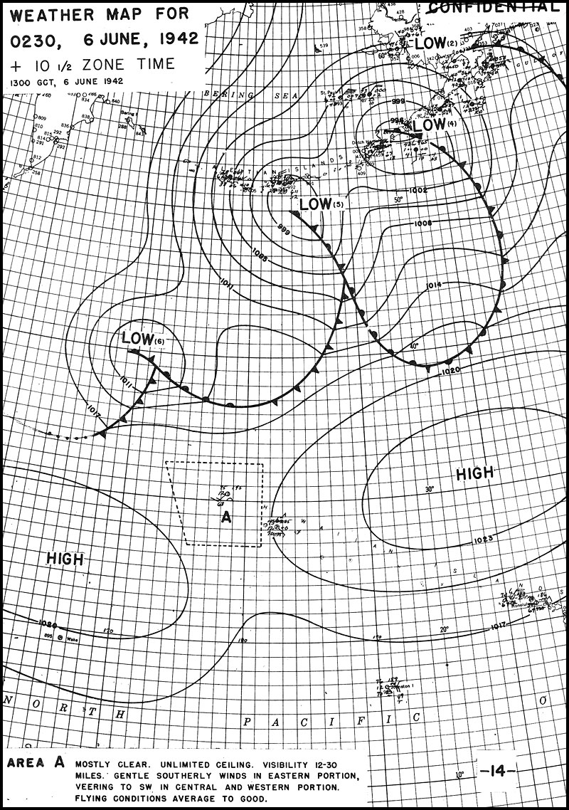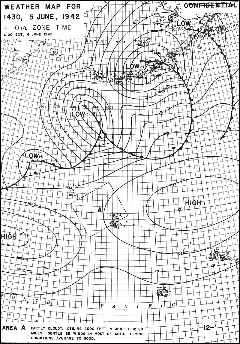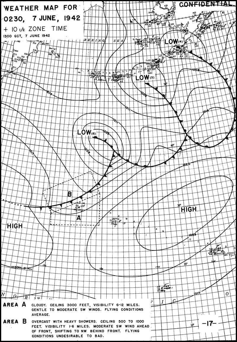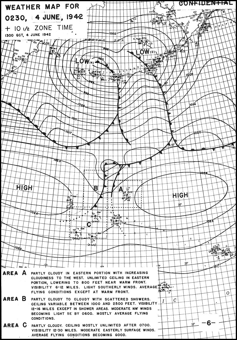 It has been assumed that two Japanese aircraft carriers advanced in a bad weather area behind the frontal system shown on the map for 0230, 3 June (Page 3) just south of the Alaskan Peninsula. Immediately behind this front there was a region of showers and low ceilings. Farther to the west, between